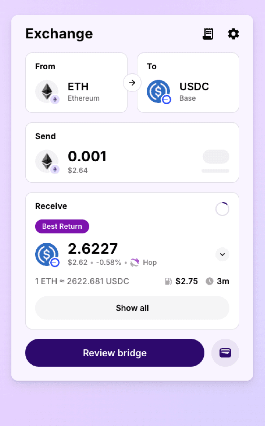 ◦ 執行: 設計了視覺化的 Route Chain。例如當用戶從 Ethereum 跨到 Avalanche 時,UI 會清楚顯示中間經過了哪些 DEX 進行 Swap,以及使用了哪一座 Bridge。這讓用戶感受到聚合器「尋找最佳路徑」的價值。