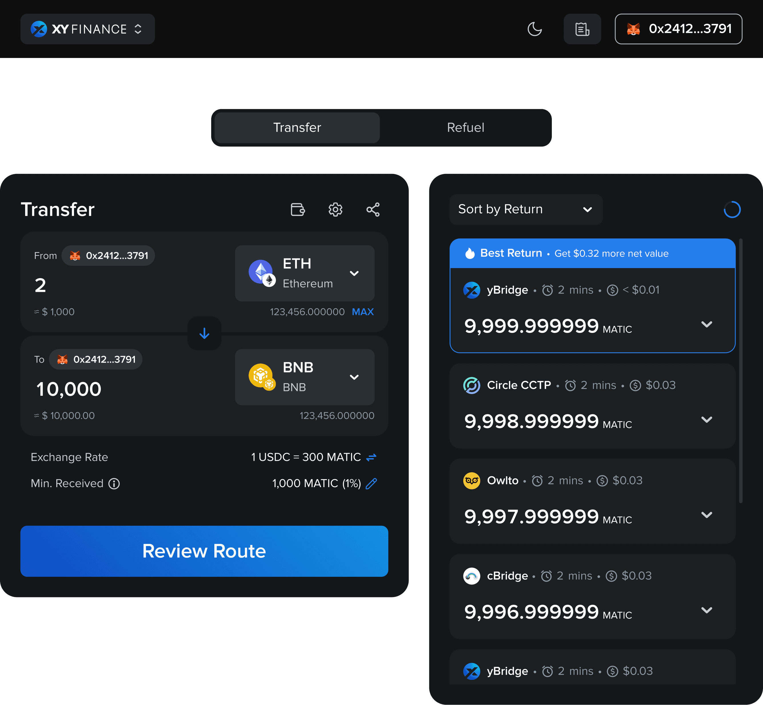 XY Finance 原本是一個 Defi 跨鏈橋,協助 user 將資產從 A chain 跨練到 B chain。因產品定位改變,由單一橋改為橋的聚合氣(類似 Sky scanner 的服務)。因此介面要如何呈現出該有的資訊