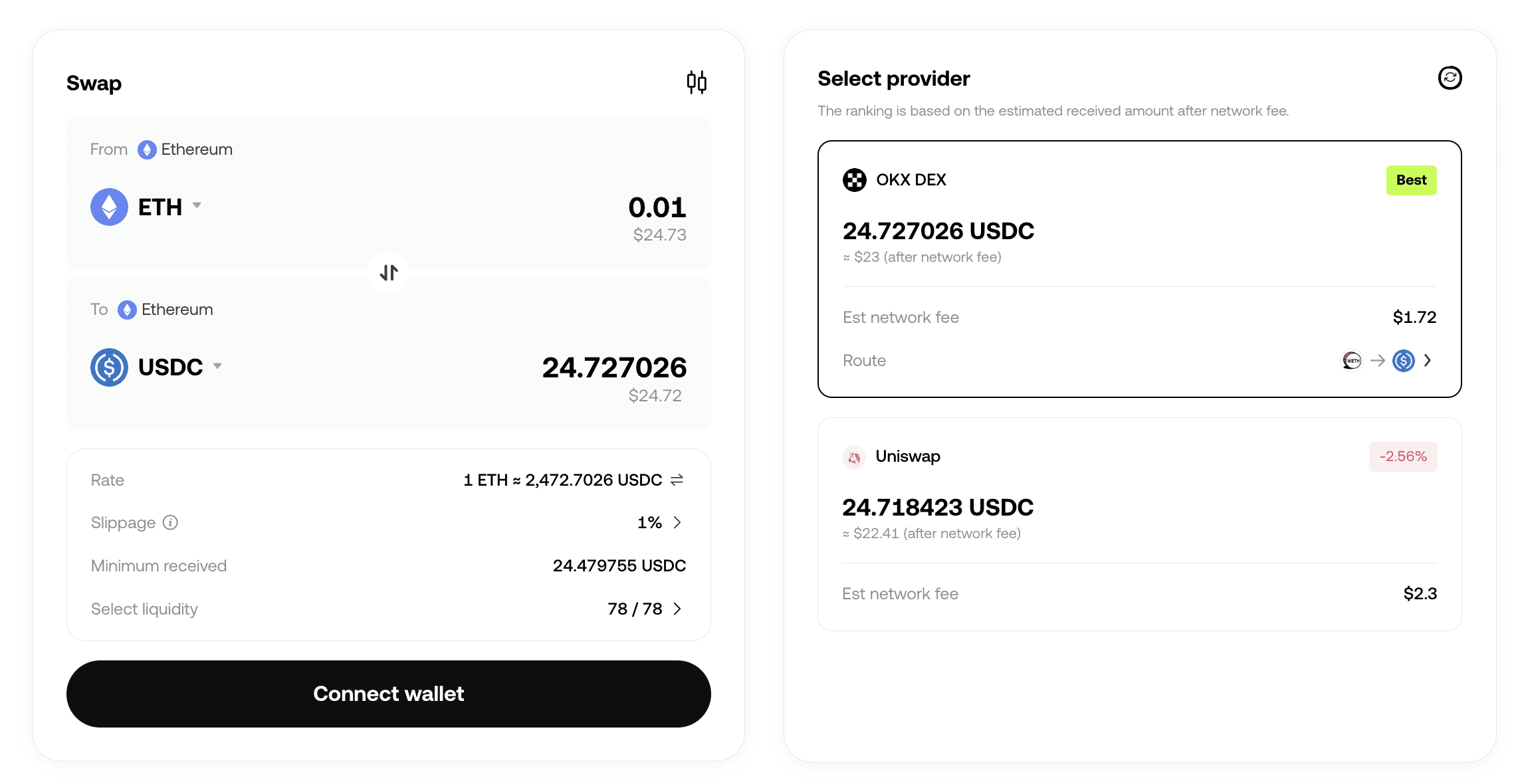(此處插入 UI 圖片:展示 Fee Breakdown 的 Tooltip 細節,以及 Route Selection 的卡片設計)