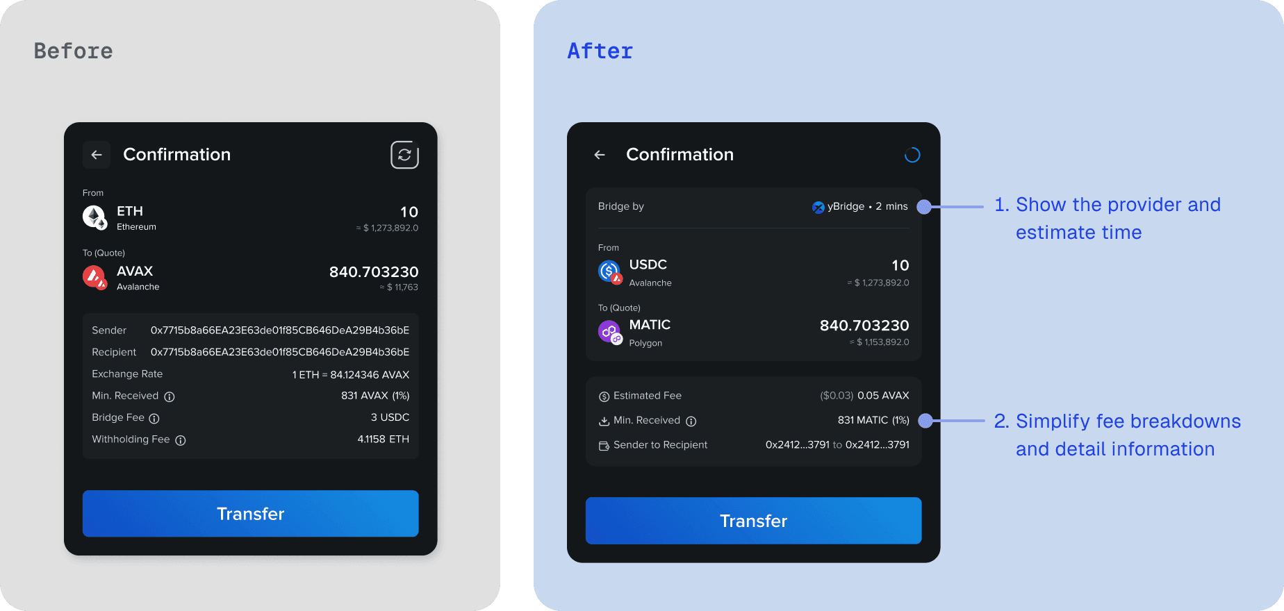 By optimizing the visual comparison of dual-end addresses, I ensured users can accurately verify all data before execution, significantly strengthening their sense of security.